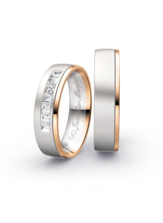 Gouden ringen Gouden ringenpaar in wit-, en roségoud met princess geslepen diamanten. Deze kun je zelf geheel aanpassen in kleur en stijl